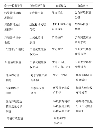 關(guān)于我國環(huán)境治理的實(shí)踐過程,張坤民等(2007) 建立了包栝命令—控制手段、經(jīng)濟(jì)刺激手段和公眾參與或稱自愿手段等多樣化的環(huán)境政策工具矩陣。見表2.1