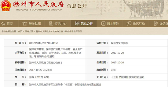 滁州市政府印發《滁州市“十三五”節能減排實施方案》