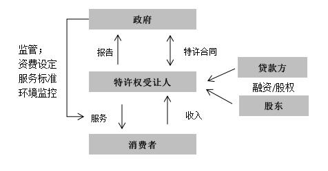 特許經營權允許社會資本運營商(受讓人)在指定區域內負資全商提供公共服務,包括系統的運營、維護,征收費用,管理,建設和修復等,同時,運營商負責所有資本投資。盡管社會資本運營商負赍提供資產,該資產即使在特許期內也屬于政府所有。政府負確定實施標準,并確保受讓人能達到標準。從本質 上講,待許經營模式將政府的角色從服務提供者轉變為服務價格和質量的規范者。