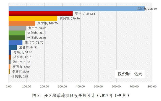 2017年1-9月,累計新落地項目投資額排名:武漢市(758.19億元)、鄂州市(356.61億元)、黃岡市(270.70億元)、咸寧市(146.70億元)、荊州市(94.81億元)、襄陽市(90.91億元)、十堰市(90.40億元)、荊門市(76.70億元)、宜昌市(44.51億元)、恩施州(14.20億元)、隨州市(12.31億元)、潛江市(10.2億元)、黃石市(8.90億元)、孝感市(5.49億元)、仙桃市(0.81億元)。