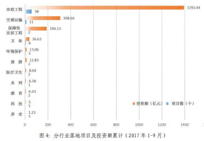 2017年1-9月,累計新落地項目數排名:市政工程(58個)、交通運輸(11個)、文體(6個)、環境保護(5個)、保障性安居工程(2個)、醫療衛生(2個)、教育(2個)、旅游(2個)、養老(1個)、水利(1個)、科技(1個)。