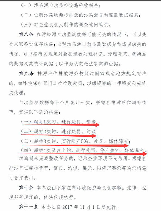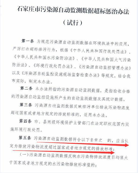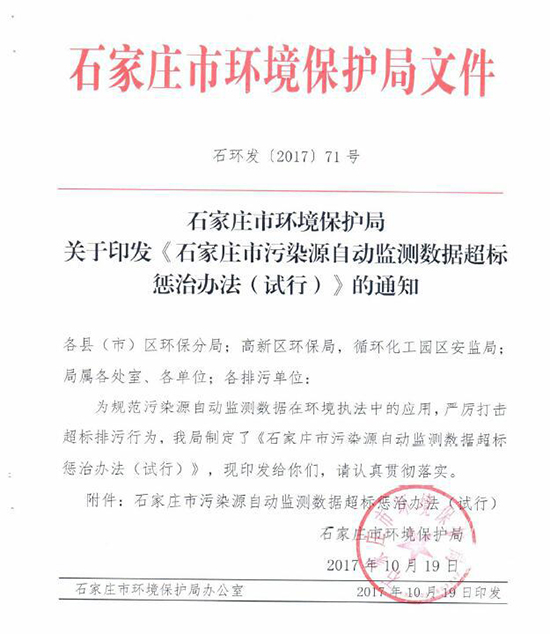 近日河北石家莊市環(huán)保局印發(fā)《石家莊市污染源自動(dòng)監(jiān)測(cè)數(shù)據(jù)超標(biāo)懲治辦法(試行)》(以下簡(jiǎn)稱(chēng)“辦法”)。辦法明確,企業(yè)污染源自動(dòng)監(jiān)測(cè)數(shù)據(jù)出現(xiàn)超標(biāo)將被處罰,超標(biāo)4次及以上,將停產(chǎn)整治。辦法自11月1日起施行。