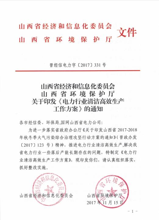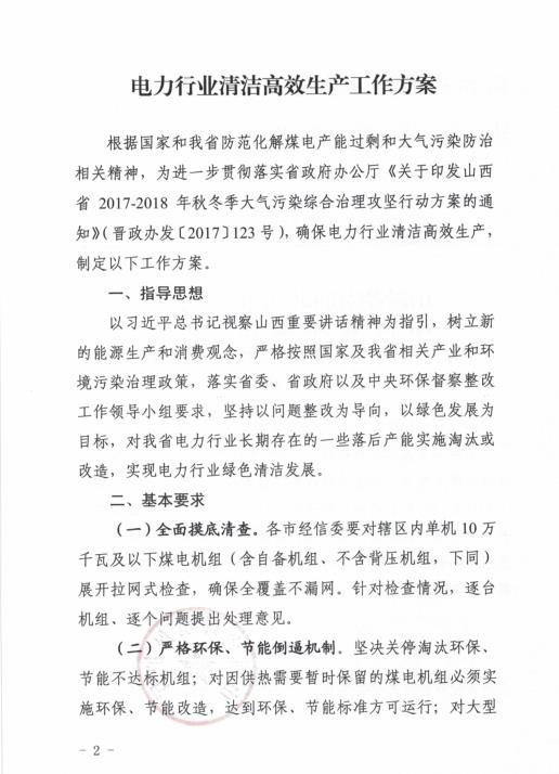 ??為進(jìn)一步落實(shí)省政府辦公廳《關(guān)于印發(fā)山西省2017-2018年秋冬季大氣污染綜合治理攻堅(jiān)行動(dòng)方案的通知》(晉政辦發(fā)〔2017〕123號)精神,推進(jìn)電力行業(yè)清潔高效生產(chǎn),解決我省電力行業(yè)一些落后產(chǎn)能長期存在的問題,特制定《電力行業(yè)清潔高效生產(chǎn)工作方案》,現(xiàn)印發(fā)你們,請認(rèn)真組織落實(shí),抓好整改實(shí)施。