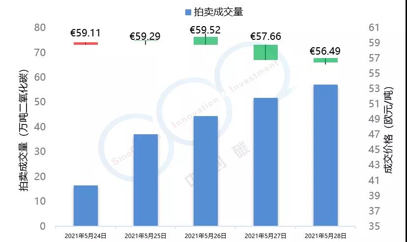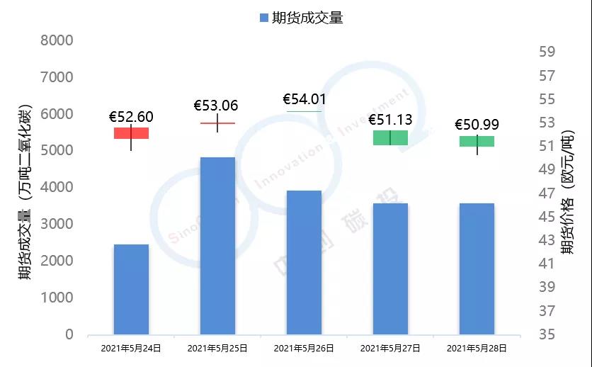 2021年5月24日至5月28日,由于全球能源市場(chǎng)表現(xiàn)較為疲軟,市場(chǎng)投資者對(duì)于配額需求的預(yù)期不景氣,歐盟碳市場(chǎng)在本周總體呈現(xiàn)下跌趨勢(shì),在本周三漲至53.59歐元/噸的頂峰后,隨即下跌近5個(gè)點(diǎn),最終收于50.95歐元/噸,回落至接近本月初水平。英國(guó)碳市場(chǎng)自上周三開(kāi)市后,在本周迎來(lái)交易的第一個(gè)整周,在短期試探了59.52歐元/噸的碳價(jià)后,英國(guó)碳價(jià)逐步回落至56.49歐元/噸,該趨勢(shì)與歐盟碳市場(chǎng)基本保持一致。本周歐盟碳市場(chǎng)期貨成交量達(dá)到1.84億噸,配額拍賣(mài)量為平均每天300萬(wàn)噸左右。英國(guó)碳市場(chǎng)本周拍賣(mài)成交量達(dá)到207萬(wàn)噸。據(jù)悉,英國(guó)政府正在考慮增加2021年英國(guó)碳市場(chǎng)配額的拍賣(mài)供應(yīng)。