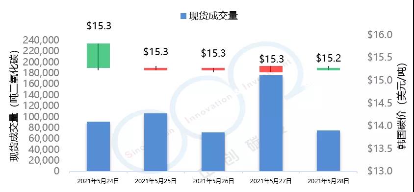 2021年5月24日至5月28日,本周韓國(guó)碳價(jià)延續(xù)上周的下跌趨勢(shì),由15.3美元/噸下跌至15.2美元/噸。本周韓國(guó)碳市場(chǎng)成交量達(dá)到52萬(wàn)噸,遠(yuǎn)高于上周7萬(wàn)噸的水平。
