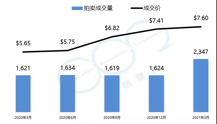 RGGI碳市場(chǎng)的初始配額發(fā)放以拍賣(mài)為主,每個(gè)季度舉行一次拍賣(mài)。2021年第一季度拍賣(mài)成交均價(jià)為$7.60美元,較上一季度漲幅為2.5%。由于弗吉尼亞州的加入,RGGI總成交量創(chuàng)歷史新高,達(dá)到了2347萬(wàn)噸。以下是由中創(chuàng)碳投統(tǒng)計(jì)的RGGI近一年的交易情況。