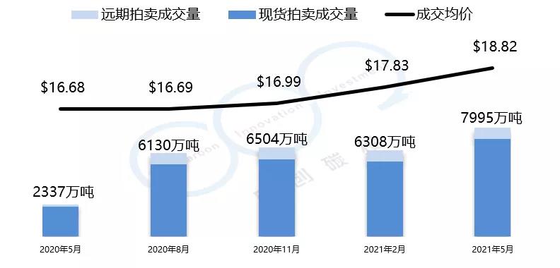加州-魁北克碳市場(chǎng)的初始配額發(fā)放以拍賣(mài)為主,每個(gè)季度舉行一次拍賣(mài)。2021年5月的第27次拍賣(mài)均價(jià)與總成交量創(chuàng)歷史新高。拍賣(mài)均價(jià)為18.82美元,較上一季度漲幅為5.6%,總成交量為7995萬(wàn)噸。以下是由中創(chuàng)碳投統(tǒng)計(jì)的加州-魁北克碳市場(chǎng)近一年的交易情況。