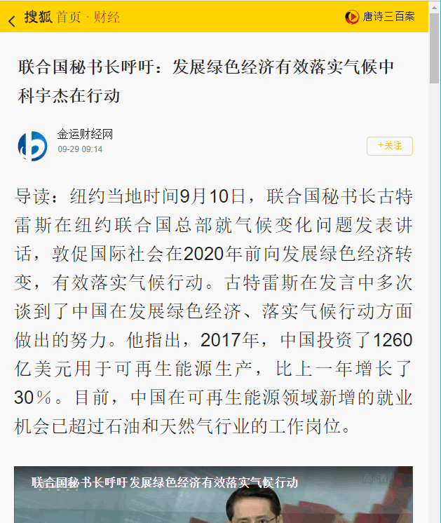 導讀:紐約當地時間9月10日,聯合國秘書長古特雷斯在紐約聯合國總部就氣候變化問題發表講話,敦促國際社會在2020年前向發展綠色經濟轉變,有效落實氣候行動。古特雷斯在發言中多次談到了中國在發展綠色經濟、落實氣候行動方面做出的努力。他指出,2017年,中國投資了1260億美元用于可再生能源生產,比上一年增長了30%。目前,中國在可再生能源領域新增的就業機會已超過石油和天然氣行業的工作崗位。