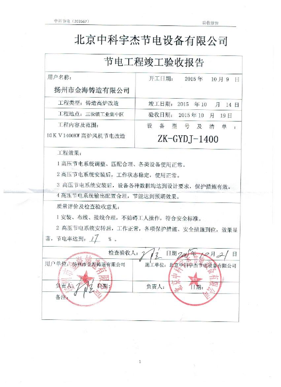 經過揚州金海鑄造管理人員的嚴格審核,中科宇杰智能風機節電系統的節能效率達到了17%,按每度電0.5583元計算,每年可為企業節省114萬元的電費,投資回報期僅不到一年。這樣的節能金額遠超出了集團領導的節能預期,取得了極大的經濟效益和社會效益。