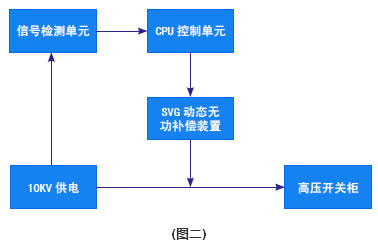 由圖二所示,在10KV高壓開關柜進線處并聯安裝SVG動態無功補償裝置,基本原理是利用可關斷大功率電力電子器件(如IGBT)組成自換相橋式電路,經過電抗器并聯在電網上,適當地調節橋式電路交流側輸出電壓的幅值和相位,或者直接控制其交流側電流,就可以使該電路吸收或者發出滿足要求的無功電流,實現動態無功補償的目的。 |