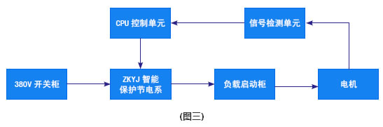 由圖三所示,在低壓380V開關柜與負載(風機、水泵、空壓機、及電機拖動類)啟動柜之間串接智能保護節電系統,系統在電機的使用上,它能自動跟蹤檢測電機運行中的負載變化,將檢測信號反饋給控制中心,經過中央處理,運算放大后給出指令信號,以此來改變有功電量的輸出,使電機在最經濟的電耗下運行,達到節電的目的。